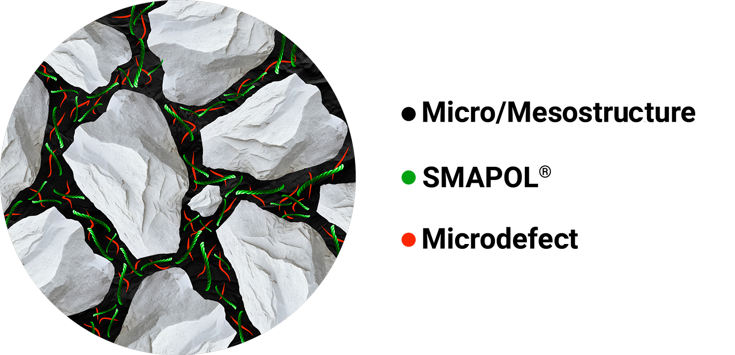 SMAPOL® additive, thanks to its optimum absorption properties and low swelling of the main ingredient – a synthetic fibre, provides microstructural reinforcement of mineral-asphalt mixtures of all types, which makes it possible to increase their long-term durability during the service life of road pavements.