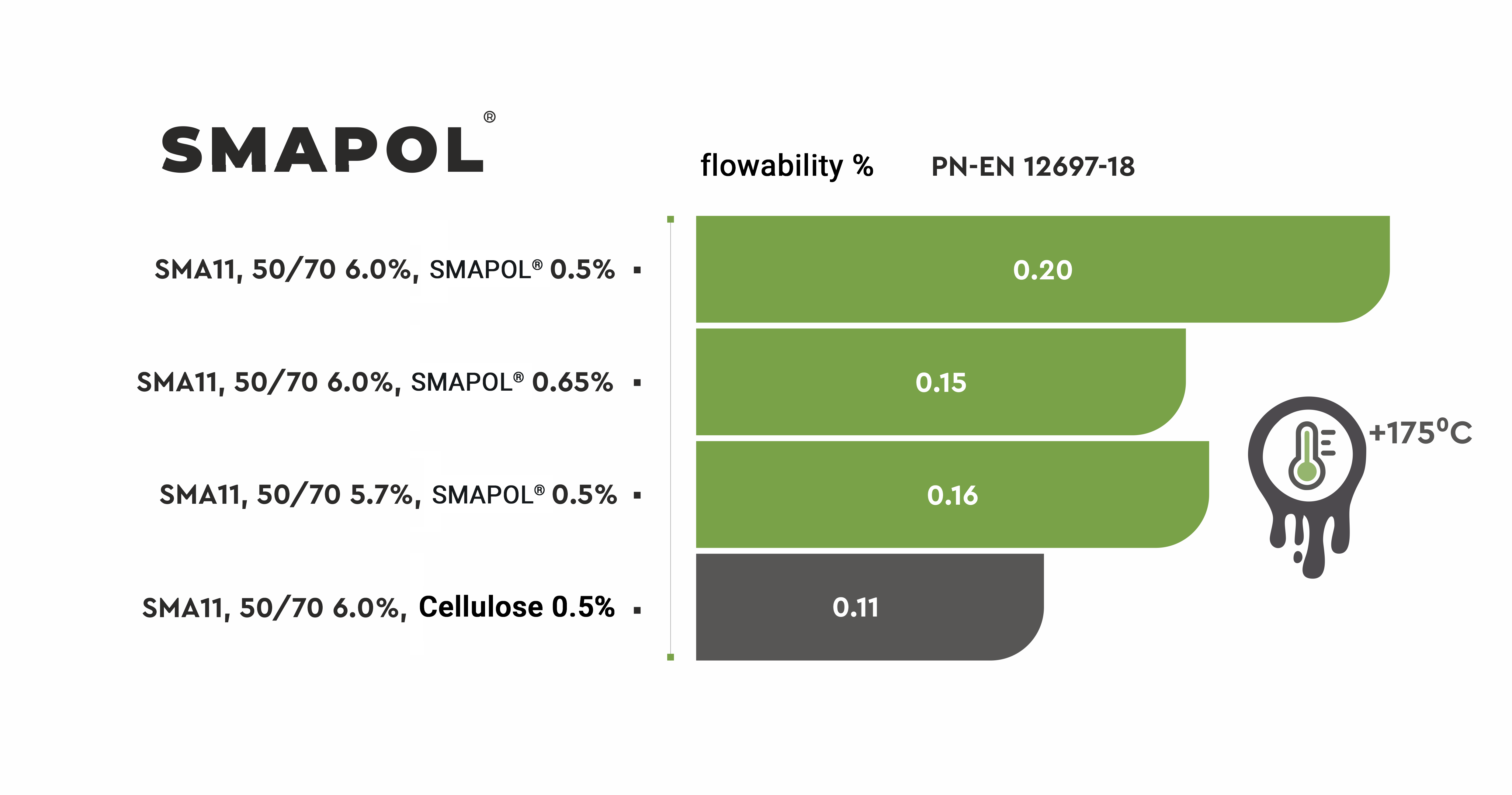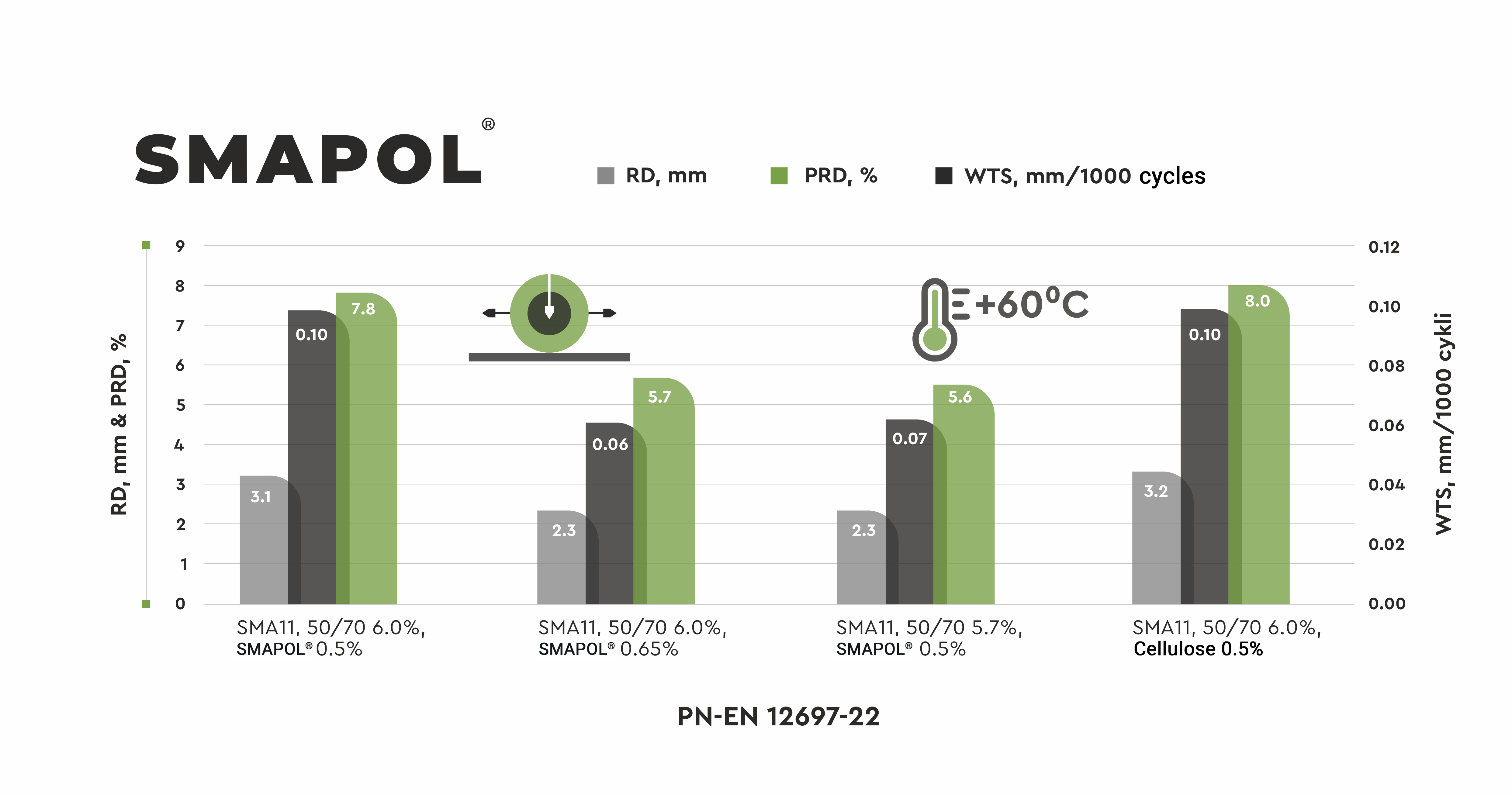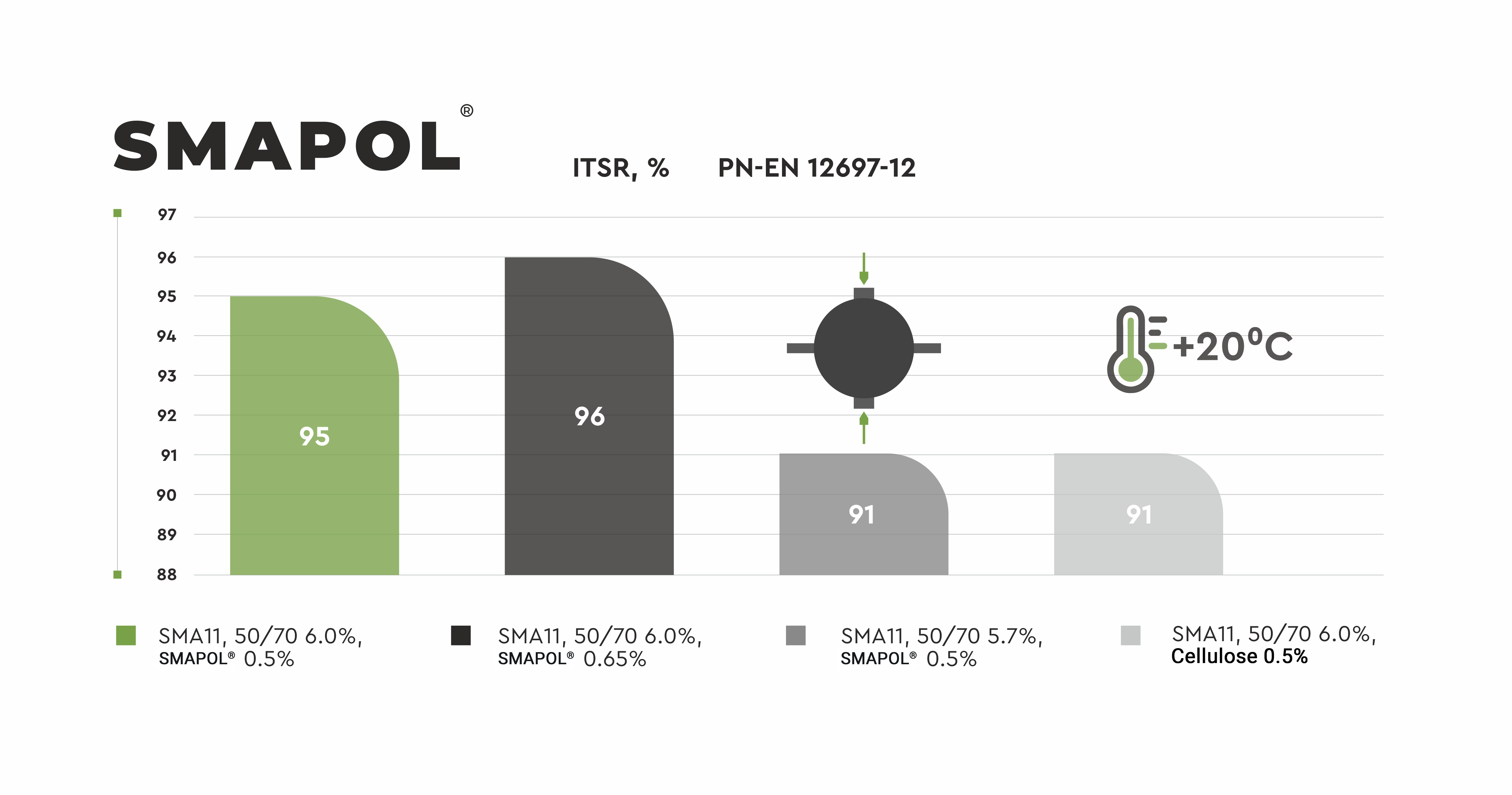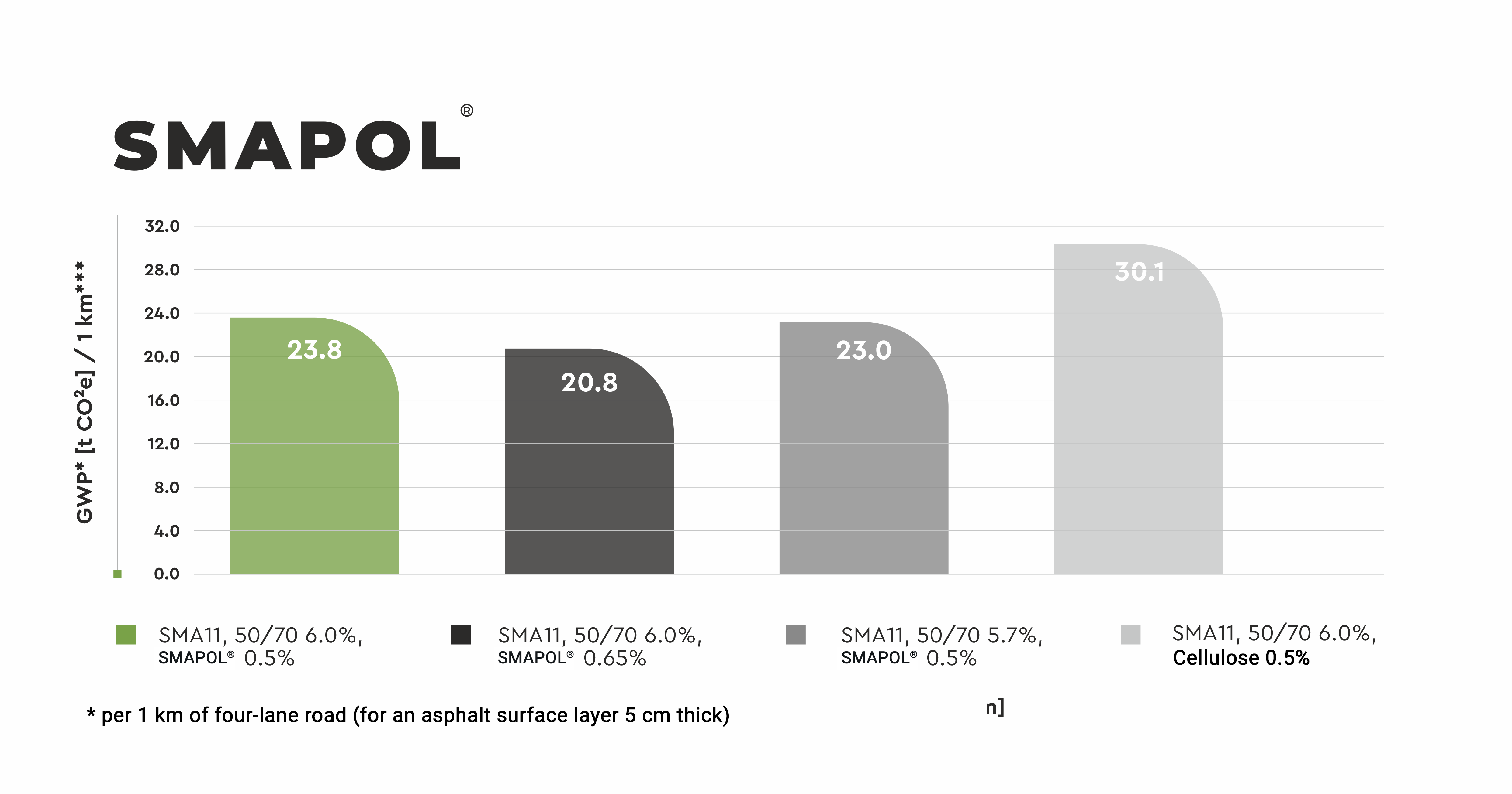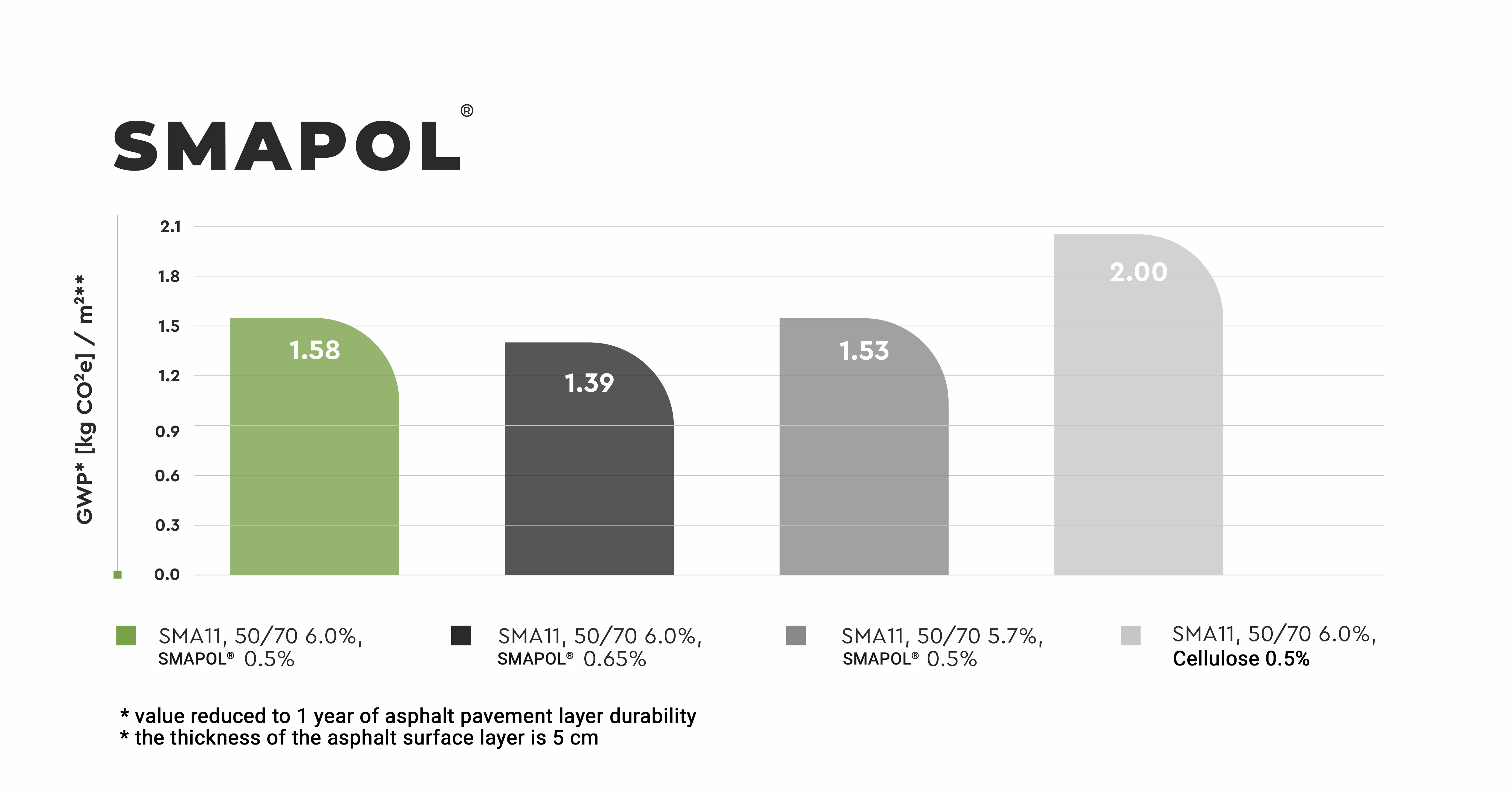 Poziom oddziaływania na środowisko wyliczony przez Potencjał Tworzenia Efektu Cieplarnianego (GWP, CO2e), zredukowany do szacowanej trwałości nawierzchni ułożonej z mieszanki asfaltowej SMA z dodatkiem SMAPOL® jest o 20-30% niższy niż dla nawierzchni ułożonej z mieszanki asfaltowej SMA z dodatkami celulozowymi.