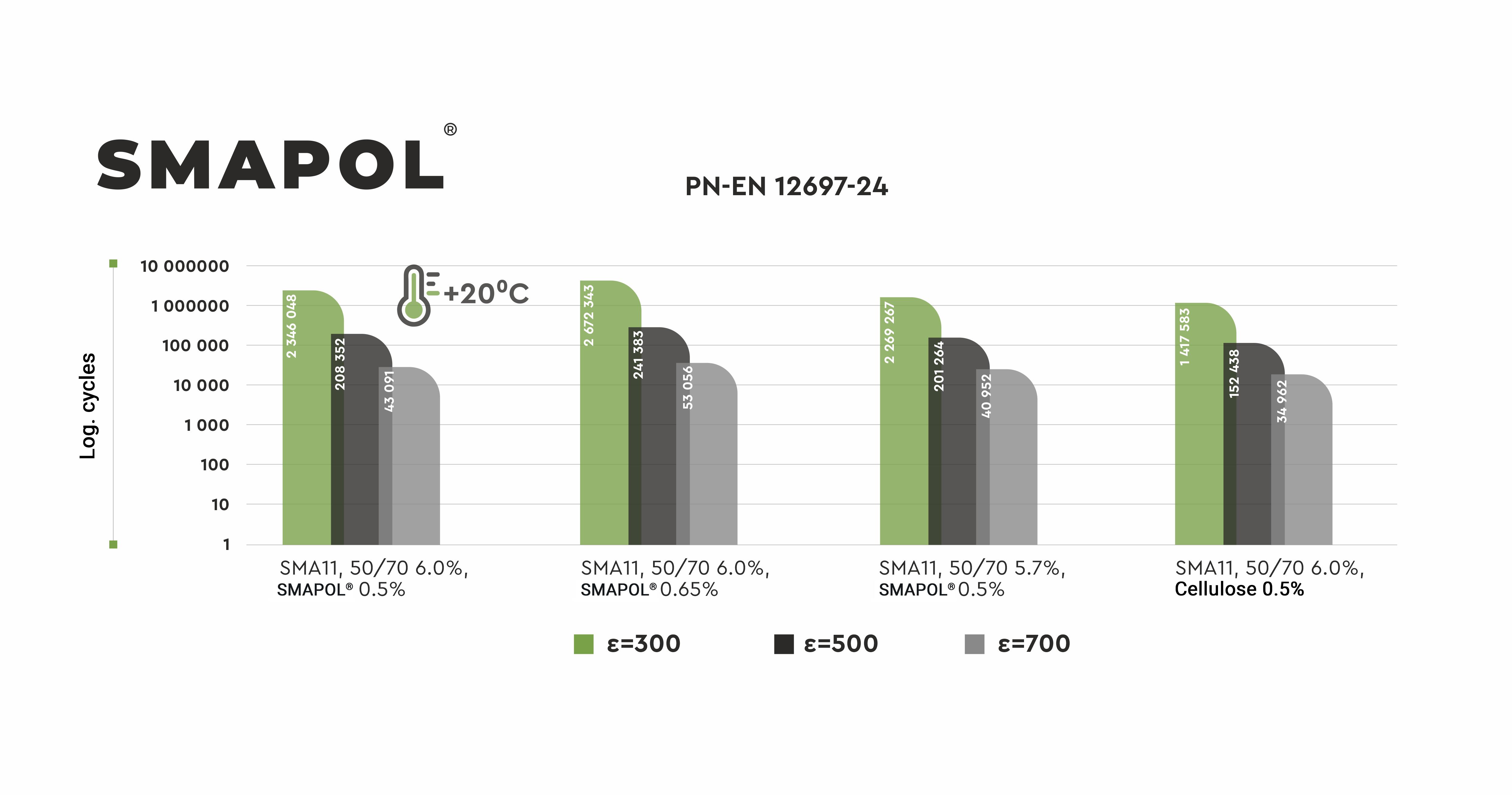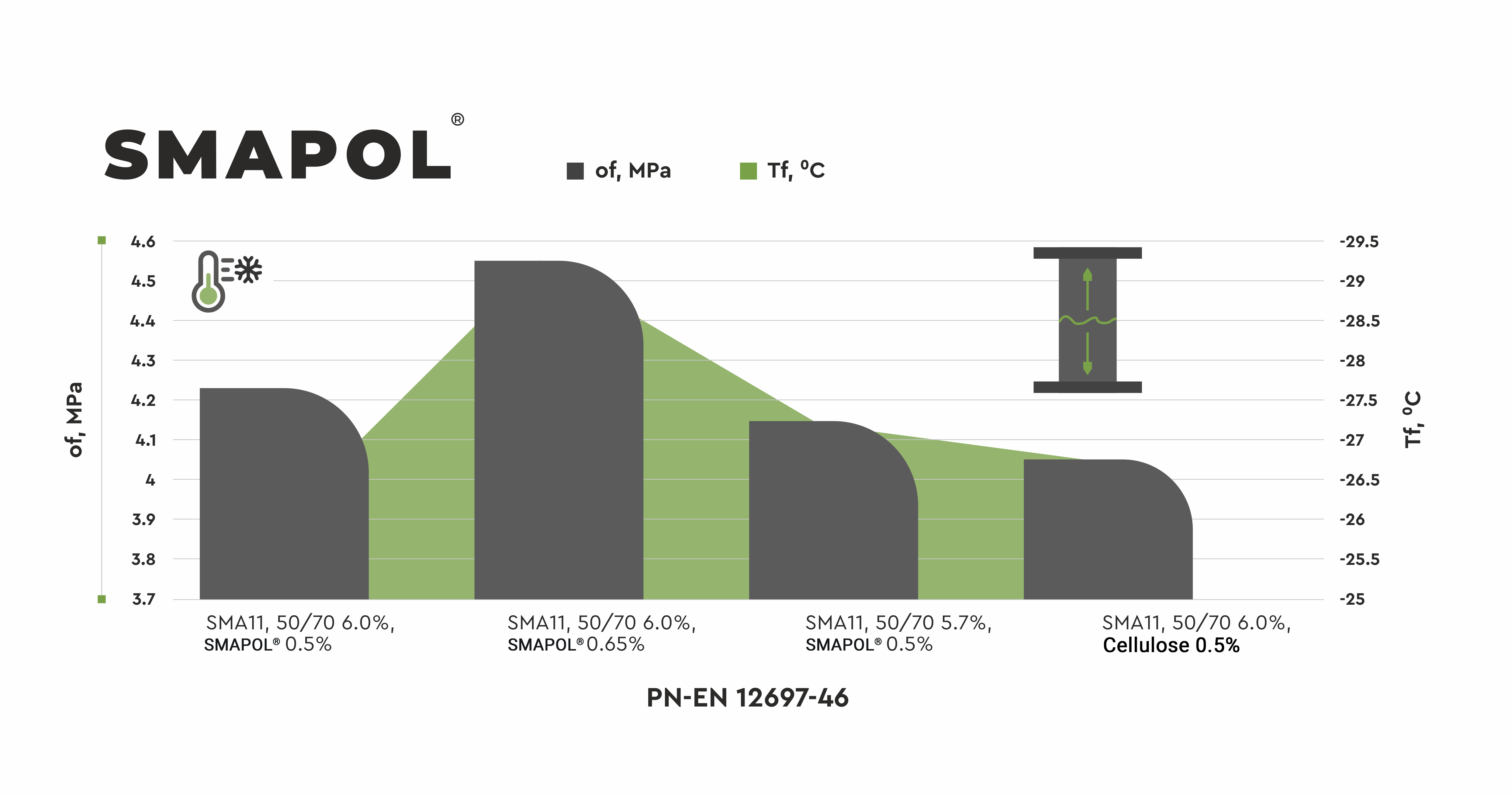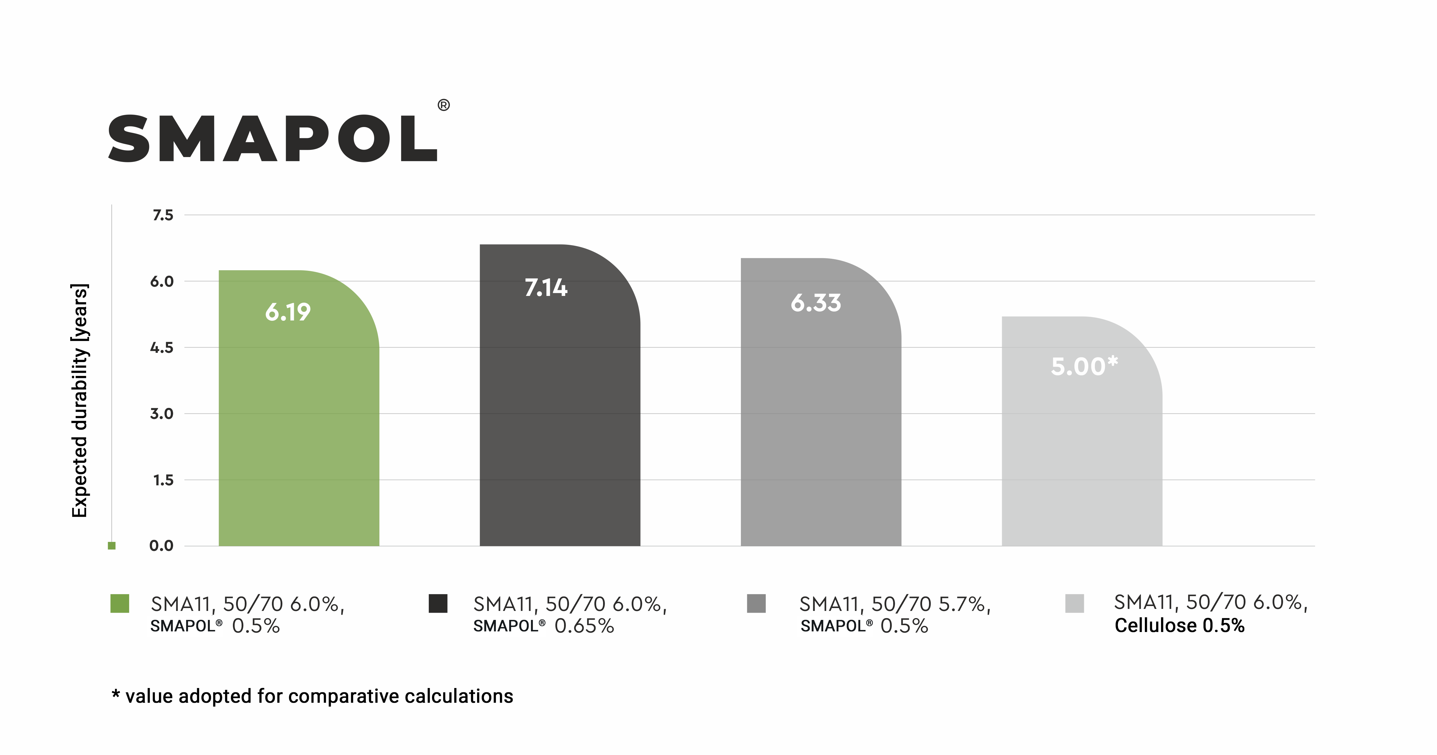 Stosując SMAPOL® zamiast dodatków celulozowych możemy liczyć nie tylko na obniżenie kosztów bezpośrednich (koszt SMAPOL® na polskim rynku jest niższy od kosztu dodatków celulozowych o 1,6-1,75 razy), ale i na uzyskanie wymiernego rocznego efektu ekonomicznego poprzez przedłużenie trwałości nawierzchni drogowych o około 25-40 %