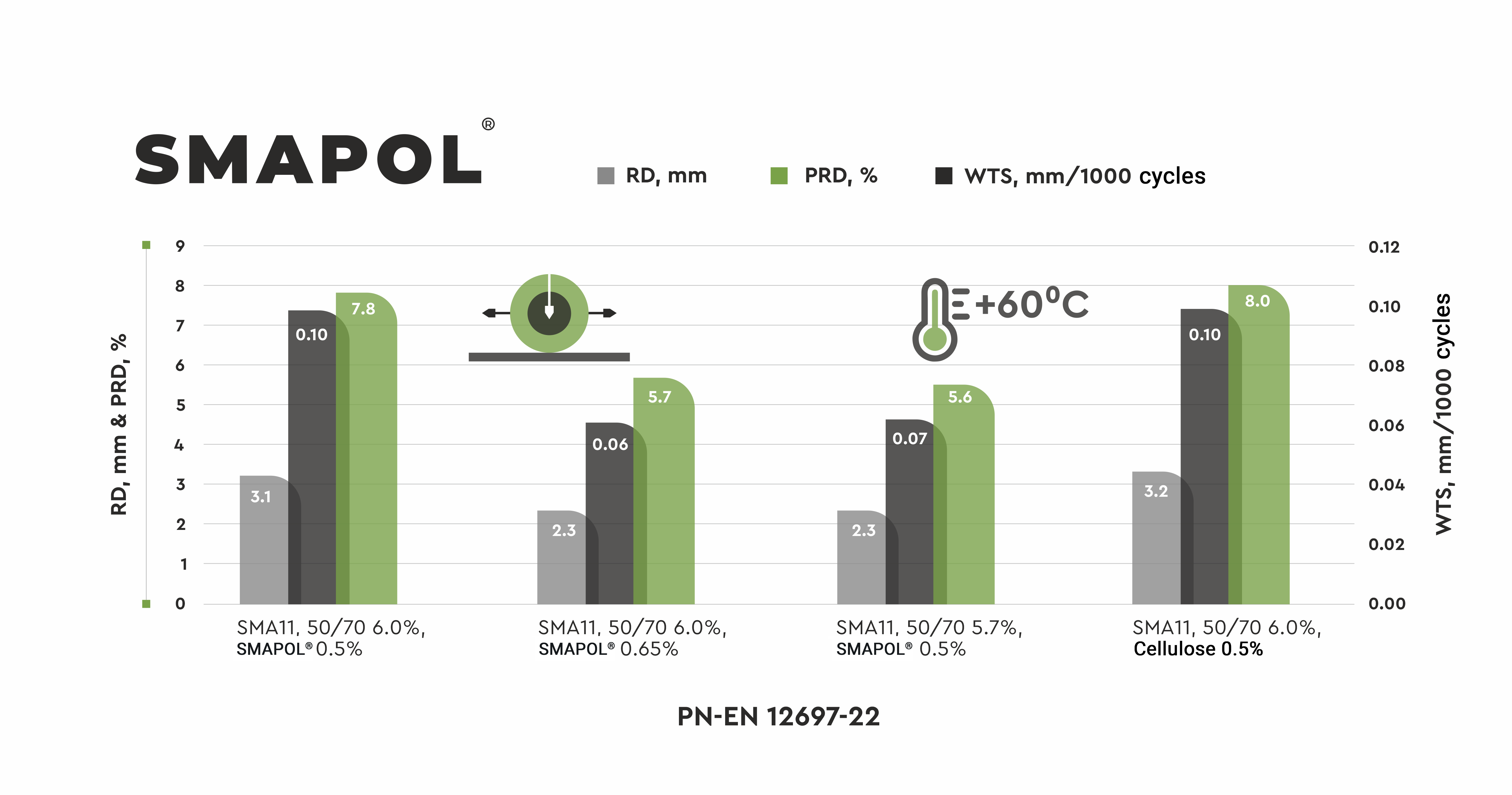 SMAPOL® zapewnia zbrojenia mikrostrukturalnego na poziomie mikro- i mezostruktury mieszanek mineralno-asfaltowych w celu zwiększenia wytrzymałości i odkształcalności. Przy czym, wspólne stosowanie SMAPOL® z modyfikowanymi (wysokomodyfikowanymi) asfaltami i asfaltami modyfikowanymi gumą w celu poprawy wytrzymałości długotrwałej nawierzchni asfaltowych zapewnia znaczny efekt synergiczny, w tym zwiększenie niezawodności i jednorodności właściwości mieszanek z destruktem asfaltowym, zarówno z zastosowaniem różnego rodzaju „odmładzaczy”, jak i bez nich.